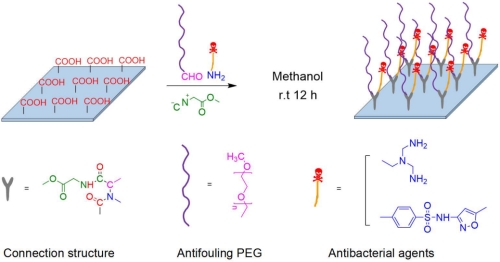 面对日益严峻的水资源紧缺现状,反渗透(RO)已成为主流的水处理技术。然而,膜污染一直是影响反渗透技术进一步发展以及制约其运营成本的一大障碍。针对上述问题,孟建强教授课题组尝试通过多组分反应在RO膜表面进行多功能修饰,一步反应同时将抗污染成分和抗菌成分引入膜表面,有效抑制有机污染、无机盐污染和生物污染,制备抗菌抗污染的反渗透膜。他们以商品化的芳香聚酰胺族(PARO复合膜为研究对象,利用其表面含有大量羧基这一结构特点,在其表面进行Ugi-4CR(乌吉四组分反应):以RO膜作为羧基组分;亲水性大分子醛基化聚乙二醇单甲醚(CHO-MPEG)作为醛基组分;带有端氨基的抗菌剂三(2-氨乙基)胺(TAEA)或磺胺甲恶唑(SMZ)作为氨基组分;廉价的异氰基乙酸甲酯作为异氰组分。在室温条件下,以甲醇为溶剂,将等物质的量的其他三组分与RO膜反应,一步反应同时在膜表面接枝亲水性分子和抗菌剂,可以有效抑制水中的有机物、无机盐以及微生物污染。