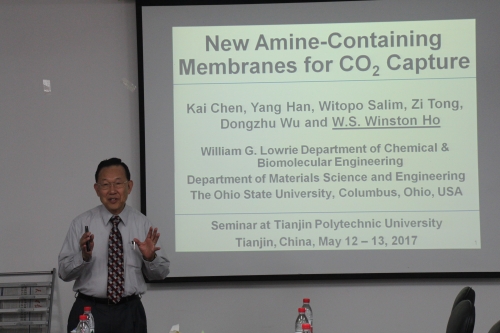 2017年5月13日,我校“新型中空纤维膜及其应用技术”教育部创新团队在材料学院6A502举行主题为“聚合物复合膜及功能化”专题学术报告会。会议邀请了我校名誉教授、美国国家工程院院士、俄亥俄州立大学何文寿(W.S. Winton Ho)教授作了题为“New Amine-Containing Membranes for CO2 Capture”的学术报告,分离膜与膜过程国家重点实验室新引进龚耿浩博士作了题为“Preparation and application of polymer-supported organosilica layered-hybrid membranes”的学术报告。报告会由李建新教授主持。