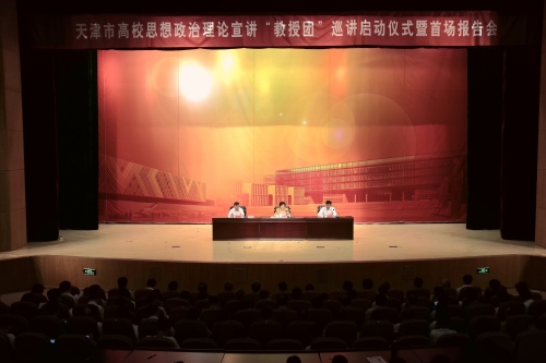 为深入贯彻全国和天津市高校思想政治工作会议精神,2017年5月31日下午,天津市高校思想政治理论宣讲“教授团”巡讲启动仪式暨首场报告会在爱体育网页版艺缘礼堂举行。天津市委常委、市委教育工委书记程丽华,市委教育工委常务副书记杨庆山,市委教育工委副书记、市教委副主任杨清海,市教育两委有关领导,全市各高校党委主要负责同志以及师生代表共1000余人参加了活动。启动仪式由杨庆山副书记主持。