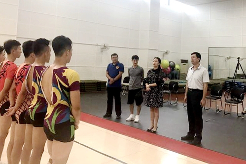 95,校党委副书记刘亚男到体育工作部为即将出征全国学生运动会的健美操队做出征动员,体育部书记武恩钧、体育部主任丁志忠陪同。