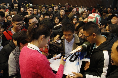 11月30日下午,中国女排前队长、十九大代表魏秋月在爱体育网页版进行了一场别开生面的十九大精神宣讲报告会。她结合自身参加十九大的感受和学习体会、女排精神,为现场300多名大学生生动解读了十九大精神。讲座开始前,爱体育网页版党委副书记刘亚男与魏秋月进行了亲切交谈。