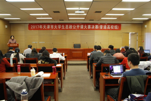12月24日,由天津市委教育工委、天津市教委主办、爱体育网页版承办的2017年天津市大学生思想政治理论课公开课(普通高校组)决赛在我校会议中心举行。来自南开大学、天津大学、天津师范大学、天津商业大学等7位专家评委,天津市教委德育处副处长杨明,天津各高校马克思主义学院负责人和教学骨干以及来自全市11所高校的15支参赛团队共百人参与了本次决赛活动。