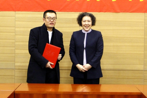 随后,在行政中心第三会议室举行了名誉学衔聘请仪式,连洁书记为魏浩波颁发了顾问教授聘书,杨庆新校长宣读了聘请决定,程博闻副校长代表学校接受了魏浩波为母校赠送的个人作品集,魏浩波表达了对母校培养的感激之情。