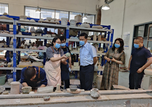 在实训中心陶艺工作室,艺术学院工艺美术系付川、金晶晶两位老师正在给工艺美术专业学生上《陶艺工艺课》,并对在工作室做毕业设计的毕业生进行指导。胡英江副书记现场观摩了学生上课情况,与两位任课教师进行了深入的交流,详细了解了学生课程作品和毕业设计作品的制作情况。他表示,学院要充分发挥专业优势,在进行艺术教育的同时开展好劳动教育,让更多的学校师生能有机会到艺术学院近距离地体验艺术,得到艺术的熏陶。艺术学院要充分利用校友资源,探讨设立专项奖学金,让毕业生们创造出更多的优秀作品,为学校校园文化建设多作贡献。