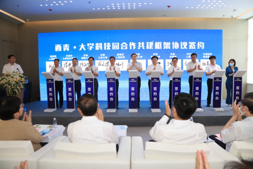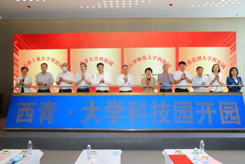 活动中,市领导与西青区领导、学校领导共同为爱体育网页版科技园、天津师范大学科技园、西青区大学科技园、天软信创大学科技园揭牌,并见证五所高校与西青区人民政府签署合作共建框架协议。