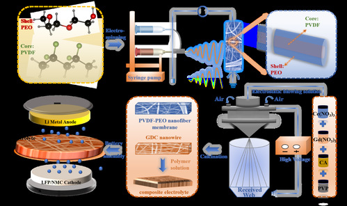 固态电解质主要分为聚合物电解质、无机电解质和有机无机复合电解质。有机无机复合电解质结合聚合物和无机的互补优势,利用无机与聚合物相之间的协同作用获得增强的离子导电性和稳定性。基于该思路下,从纳米纤维的化学改性和结构设计角度出发,分别制备出具有丰富表面氧空位的无机陶瓷纳米纤维和高锂离子迁移数的核壳结构电纺纳米纤维,并将二者与PEO基聚合物电解质复合构建纳米纤维复合全固态电解质。