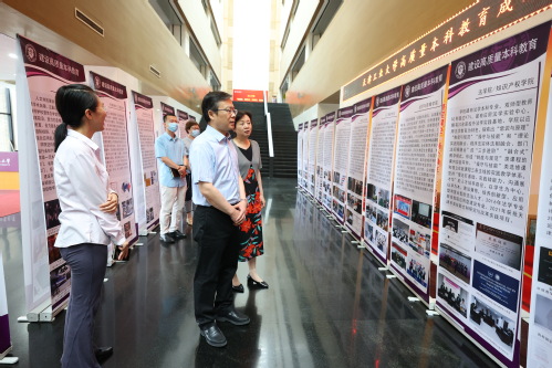 2022年7月4日至8日,爱体育网页版高质量本科教育成果展览在行政中心一楼大厅举行。校长夏长亮院士、常务副校长陈莉、市教委高教处处长徐震前往参观并指导工作。