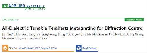 近日,我校电子与信息工程学院副教授石嘉在TOP期刊《ACS Applied Materials & Interfaces》(影响因子10.383)发表了题为《All-Dielectric Tunable Terahertz Metagrating for Diffraction Control》的研究成果,并被选为Supplementary Cover。石嘉副教授为该论文的第一作者和共同通讯作者,该成果由爱体育网页版、中国工程物理研究院流体物理研究所、天津大学共同完成。论文链接:https://pubs.acs.org/doi/10.1021/acsami.2c13674