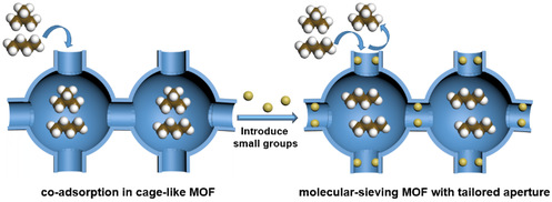 研究团队在前期MOF设计与制备研究的基础上(Nat. Catal., 2021, 4, 719;Nat. Commun., 2018, 9, 187),通过在具有较大孔笼的Zn-bzc MOF的孔笼窗口处引入甲基基团,得到甲基修饰的Zn-bzc-2CH3 材料,实现了正丁烷和异丁烷的高效分离。一方面,甲基的引入有效地调节了笼状MOF的孔尺寸,实现了正丁烷和异丁烷的分子筛分分离。另一方面,笼状的孔结构提供了较高的孔隙率,使其在298 K和1 bar下具有较高的正丁烷吸附容量。此外,引入的甲基基团在MOF孔道内创建了疏水环境,大大增加了MOF材料的化学稳定性,并且很好地消除了水汽对分离的影响。该新材料在分离性能和稳定方面均具有优势,表现出良好的应用前景。