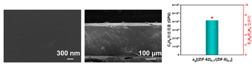图2:自支撑ag[(ZIF-62)0.7/(ZIF-8)0.3] MOF玻璃混合基质膜的表面、断面电子扫描电镜图和C2H6/C2H4分离性能图