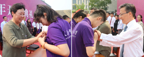 在雄壮的国歌声中,典礼拉开序幕。校党委书记沈江、校长夏长亮院士为新生代表佩戴校徽,台下学生全体起立,集体佩戴校徽。熠熠闪光的校徽不仅是“天工人”的身份证明,更象征着天工学子对“严谨、严格、求实、求是”校训精神的恪守与传承,激励着每一位新天工人砥砺前行、追求卓越。