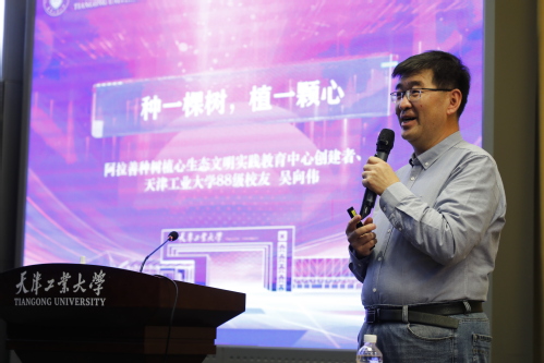 报告会上,吴向伟校友向大家分享了他以“锁边”生态理念开展阿拉善防沙治沙和生态环保事业的事迹。20余年来,作为阿拉善种树植心生态文明实践教育中心创建者,吴向伟校友与家人一起积极投身于阿拉善腾格里沙漠防沙治沙公益事业,至今已建成南北近20公里、东西平均1.5公里的沙漠锁边林核心示范区,种植乔灌木1000多万株,并总结提炼了“锁边生态”、“种树植心”生态建设和人文发展理念,创造性开展了面向广大中小学生的自然课堂和劳动教育活动、面向家庭和社会的实践参与活动、面向企事业团体的社会责任提升活动,致力于推进人与自然、人与人、人与自身和谐相处的生态文明实践教育事业,颇有成效,影响深远。