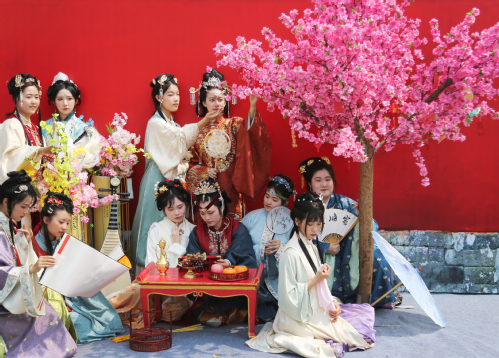 “国风市集”上,参与体验活动的师生学习棋艺、采选、品茶等传统技艺,现场更是用“飞花令”以诗会友、切磋琢磨。步入“汉服体验区”,如同进入大型穿越现场,一群仿佛从画里走出来的青年学子,国风妆造、古朴典雅、青春扑面,沉浸式复刻了国风霓裳的美好景象。柴锦萱是这次体验活动的学生组织者之一,在她看来,这次体验活动对准了当下年轻人的口味,“今年过年期间‘马面裙’就特别火,这种经过改良创新的衣服轻盈且优美。国风服饰穿在身上,是我们年轻人对美好生活的一种定义,也能让我们更深刻的理解服饰背后的传统文化内涵。”