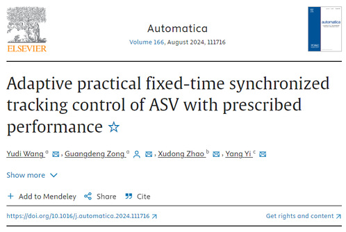 近日,我校控制科学与工程学院宗广灯教授团队论文“Adaptive practical fixed-time synchronized tracking control of ASV with prescribed performance”在控制领域顶级期刊《Automatica》上发表,DOI: 10.1016/j.automatica.2024.111716。