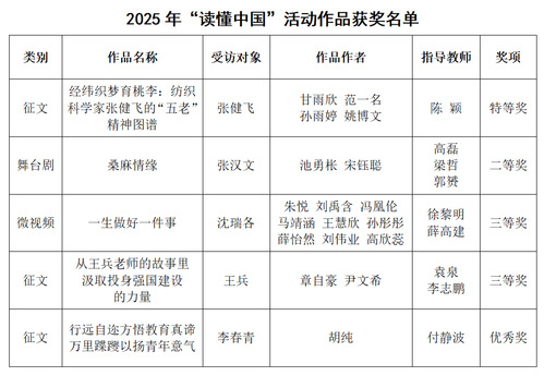 近日,天津市教育系统关心下一代工作委员会公布了2025年“读懂中国”活动获奖作品名单,我校选送的3篇征文、1个舞台剧、1个微视频作品均获奖。同时,因组织工作得力、成绩突出,我校被教育部关工委提名表扬。