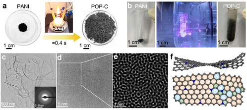 (a)温和加热引发与(b)微波诱导触发的能量自给型“爆米花”反应过程;(c-e)合成的二维碳纳米片多尺度结构表征结果;(f)二维碳纳米片的模拟结构。